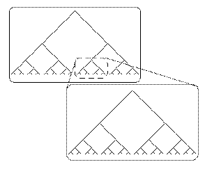Alternatively, when the user selects the ``Fractal'' button, he/she can obtain fractal views from the focus. Initially, fractal views do not display the whole path to the root. By changing a threshold with a slider, it is possible to increase the number of displayed nodes almost continuously, such as in Figure 8. %The reason we use the slider to change the threshold is that there are %more effective thresholds in fractal views than in fisheye views. When the user selects another node, the fractal view from the new focus is obtained interactively. Then, the number of displayed nodes is kept to be nearly constant even if the user focuses on any nodes. The combination of the fractal layout and the fractal pruning made it easier to browse huge trees such as UNIX directories.