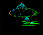 A visualization system (This system was implemented in our software visualization system VOGUE[8,9].) for UNIX directories is implemented. Figure 5 is a snapshot of the screen. When the system is executed with a directory name, after the directory information is obtained by using UNIX system calls, a 3D tree whose root node represents the directory appears on the screen. The reason we adopted the 3D framework is to make effective use of the screen. Each node corresponds to the UNIX file, and its label represents its pathname. The color assigned to nodes represents file's type such as ASCII file, binary file, or directory. The relation between a parent directory and its subdirectory is represented as a link. Symbolic links in UNIX are represented as additional links with different color.